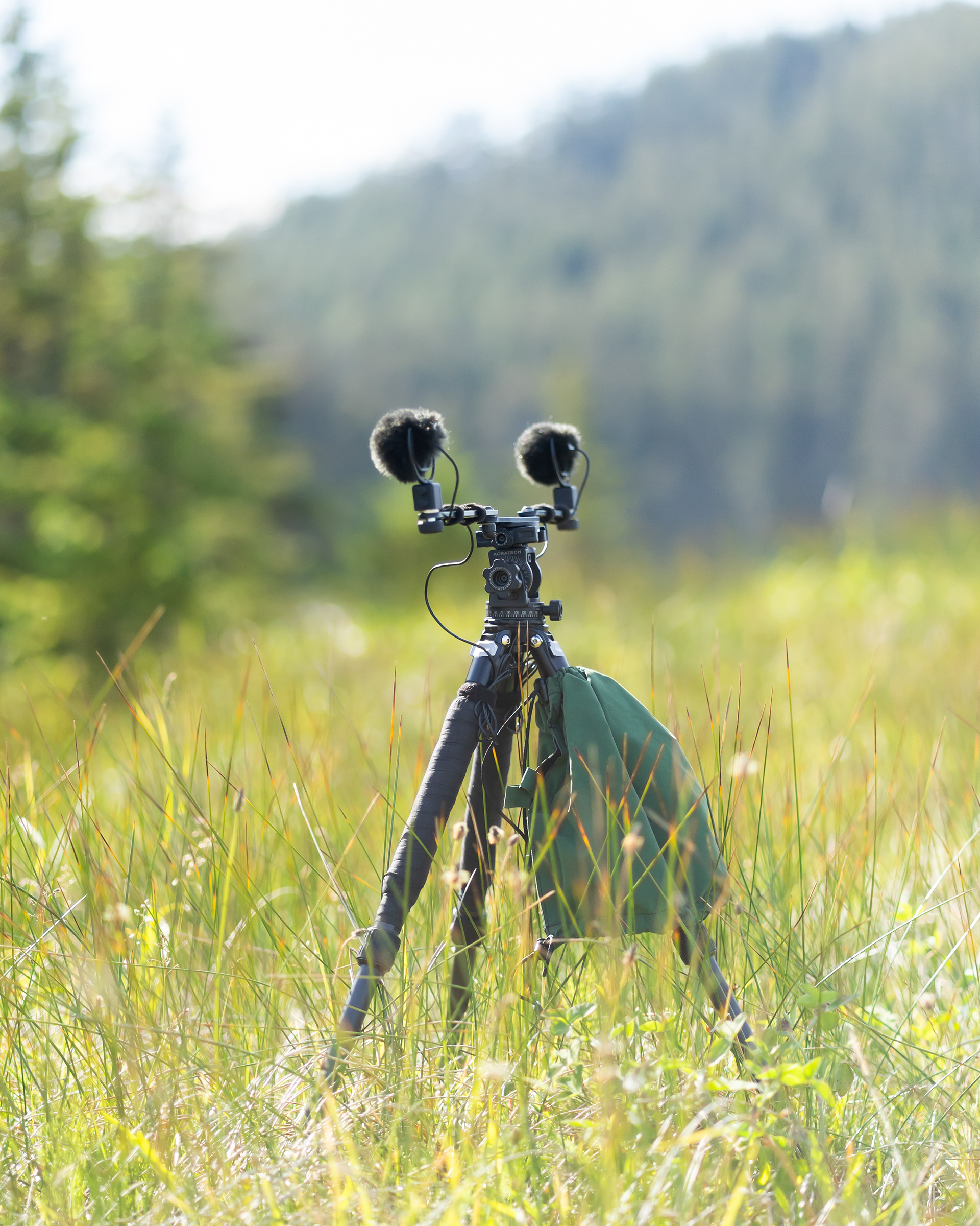 I set up my mics in a way that maximizes the stereo effect, sometimes on a tripod, other times strapped on either side of a tree.