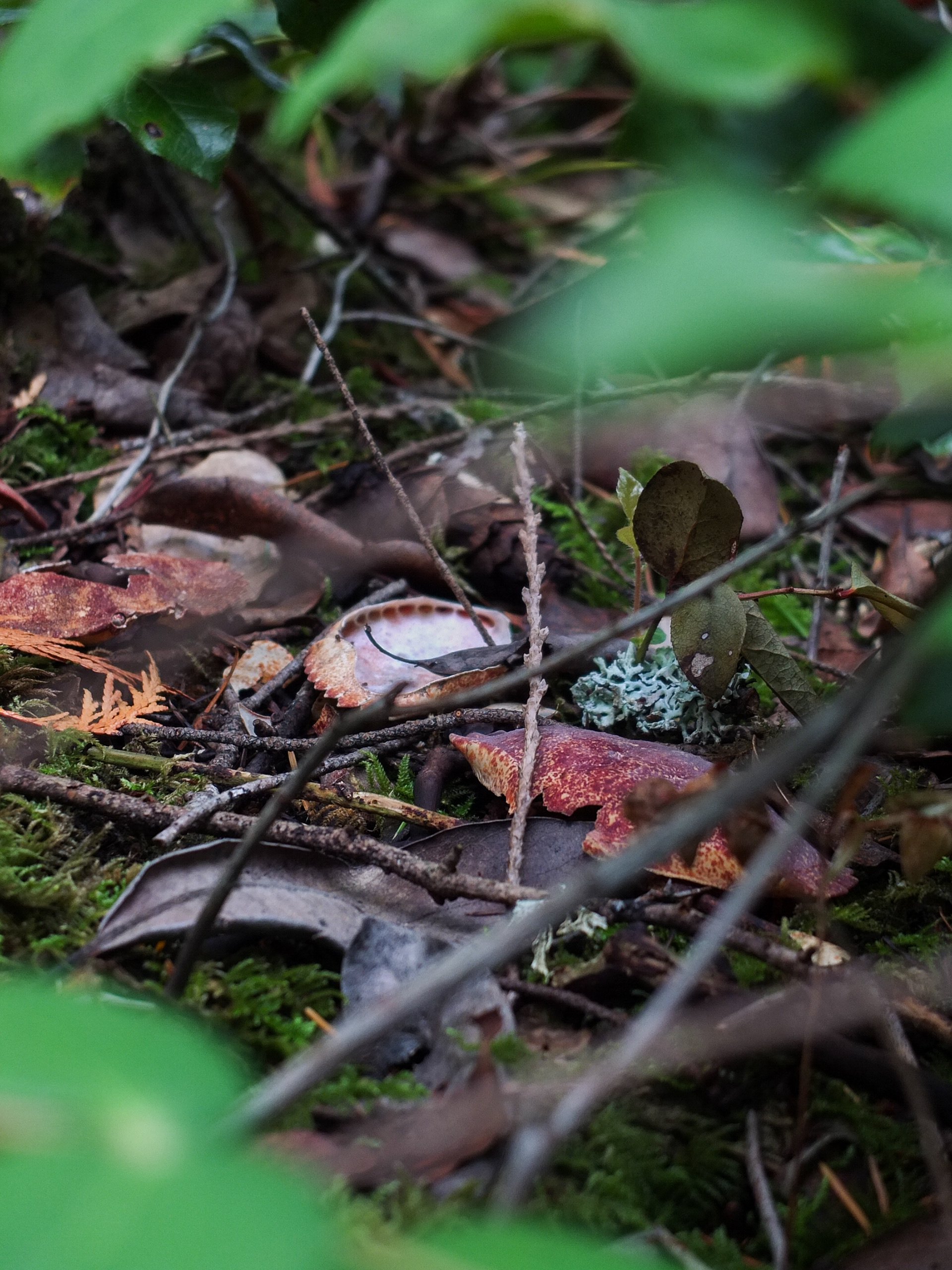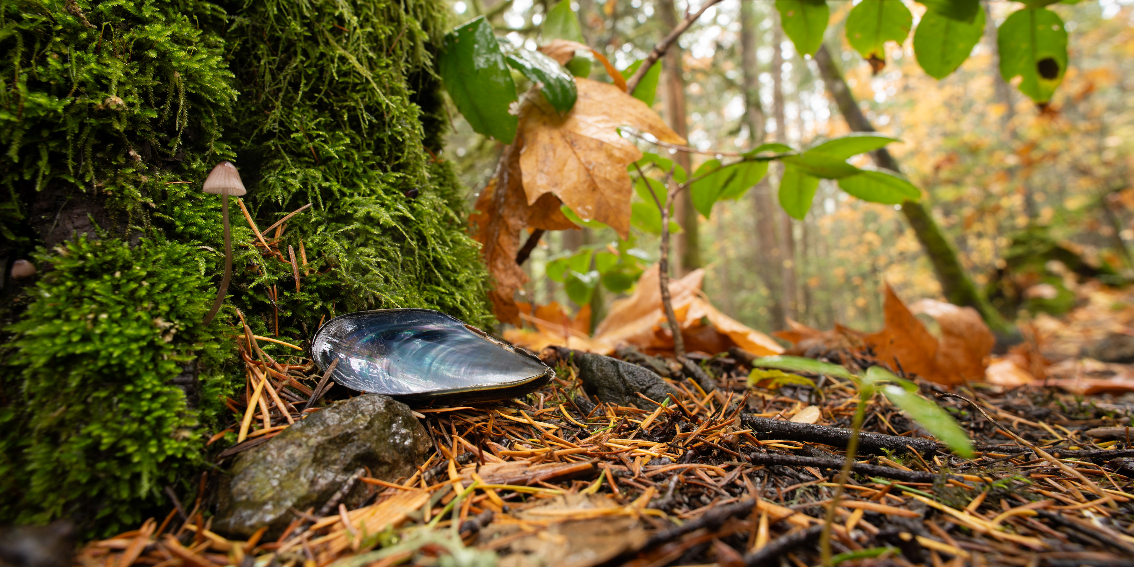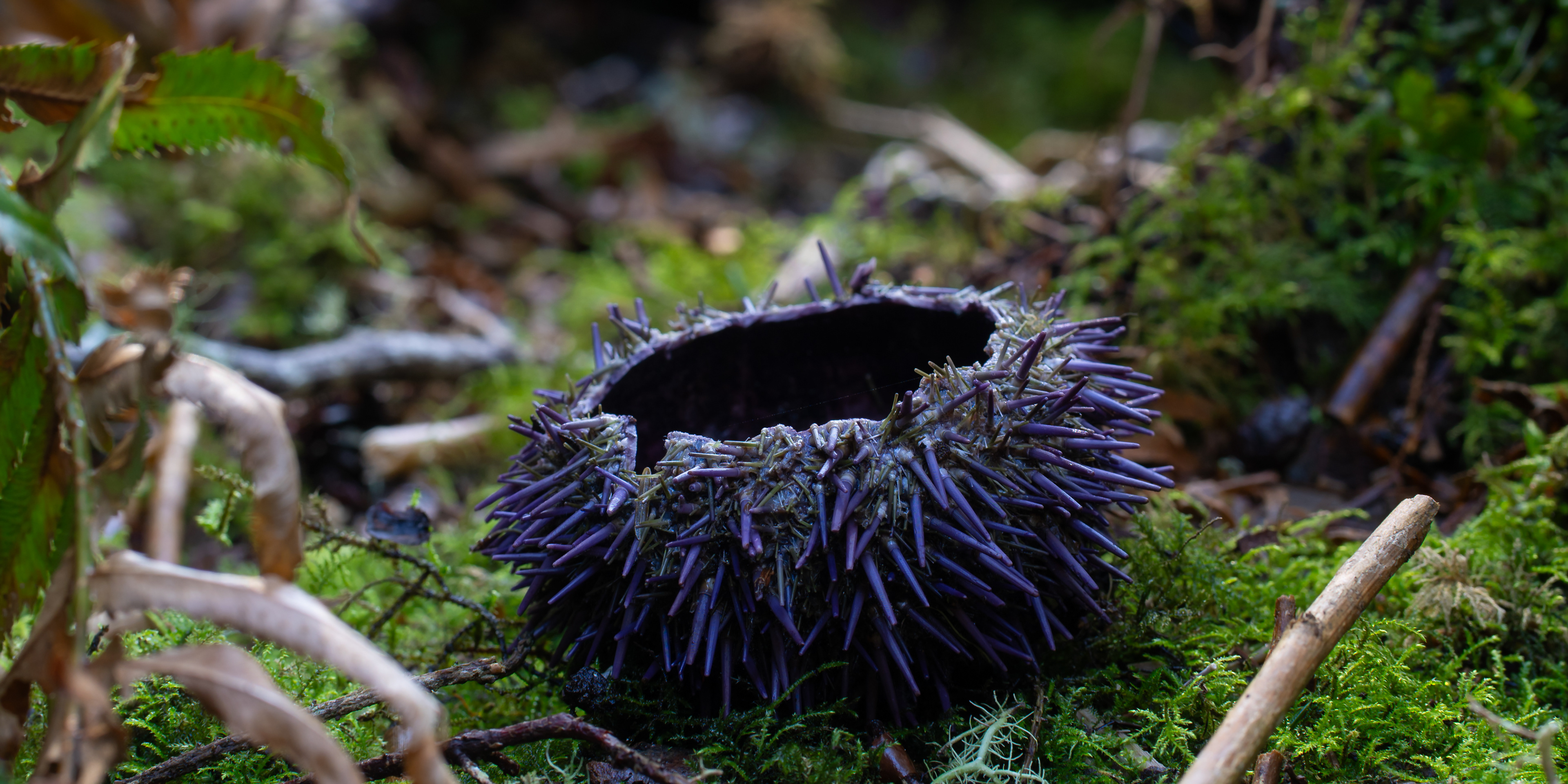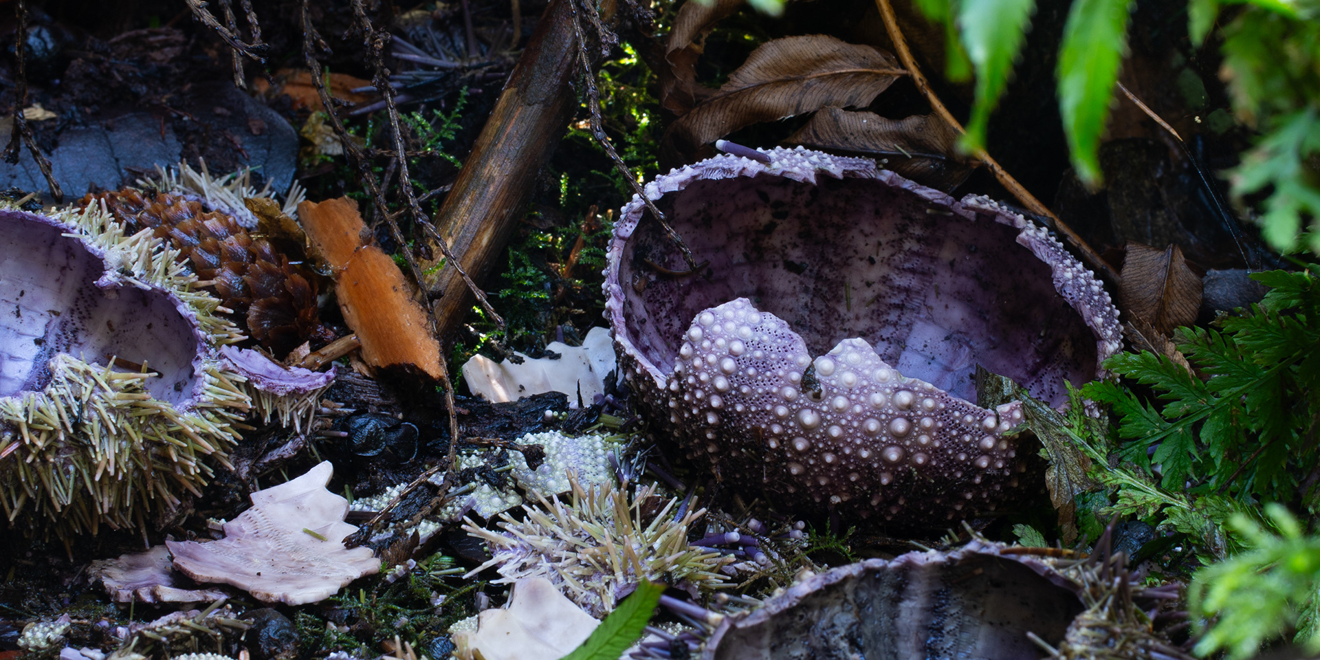 While photographing a water fall I noticed a bunch of sun bleached shell fragments in the moss. looking closer I found a freshly eaten Urchin resting in a bone yard of its own kind.